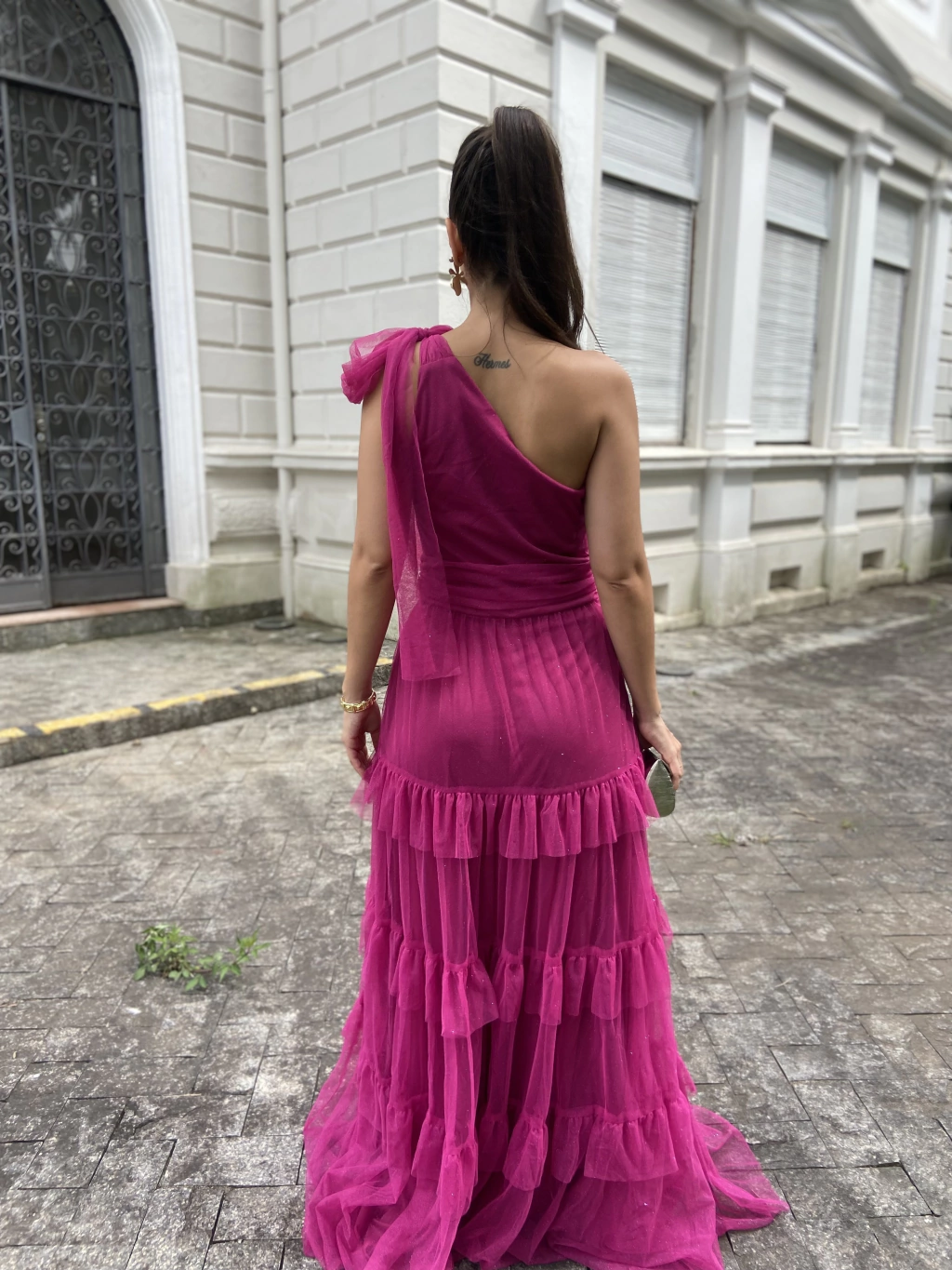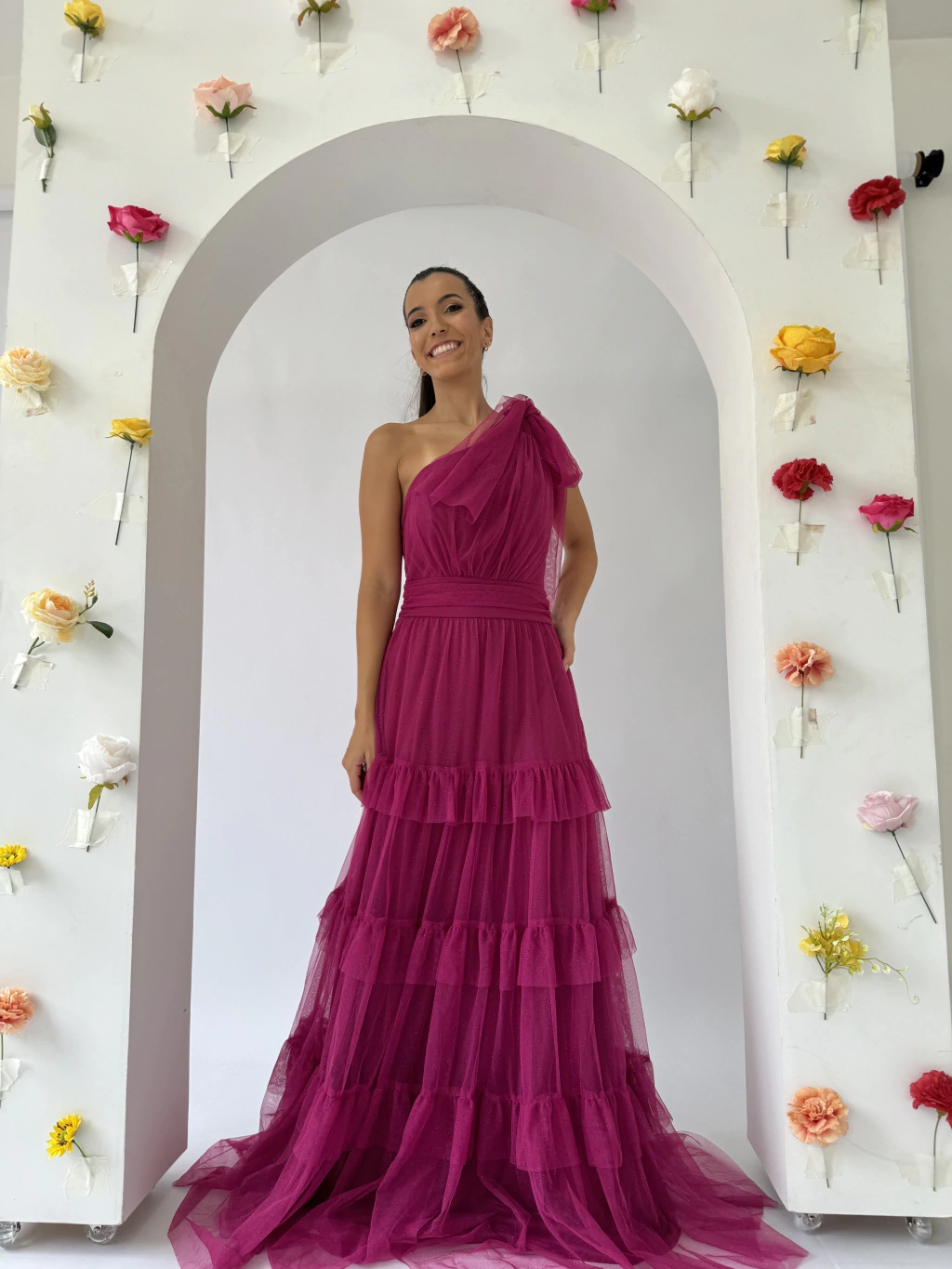 Descrição: O Vestido Brilho é pura elegância e sofisticação para ocasiões especiais. Confeccionado em tule com um brilho delicado, ele possui um ombro só com amarração em tule ajustável, decote elegante e bojo, garantindo conforto e sustentação. O fechamento em zíper na lateral facilita o ajuste, enquanto o detalhe franzido na cintura valoriza a silhueta. Com seu caimento leve e sofisticado, esse vestido é ideal para quem quer brilhar em festas e eventos à noite.