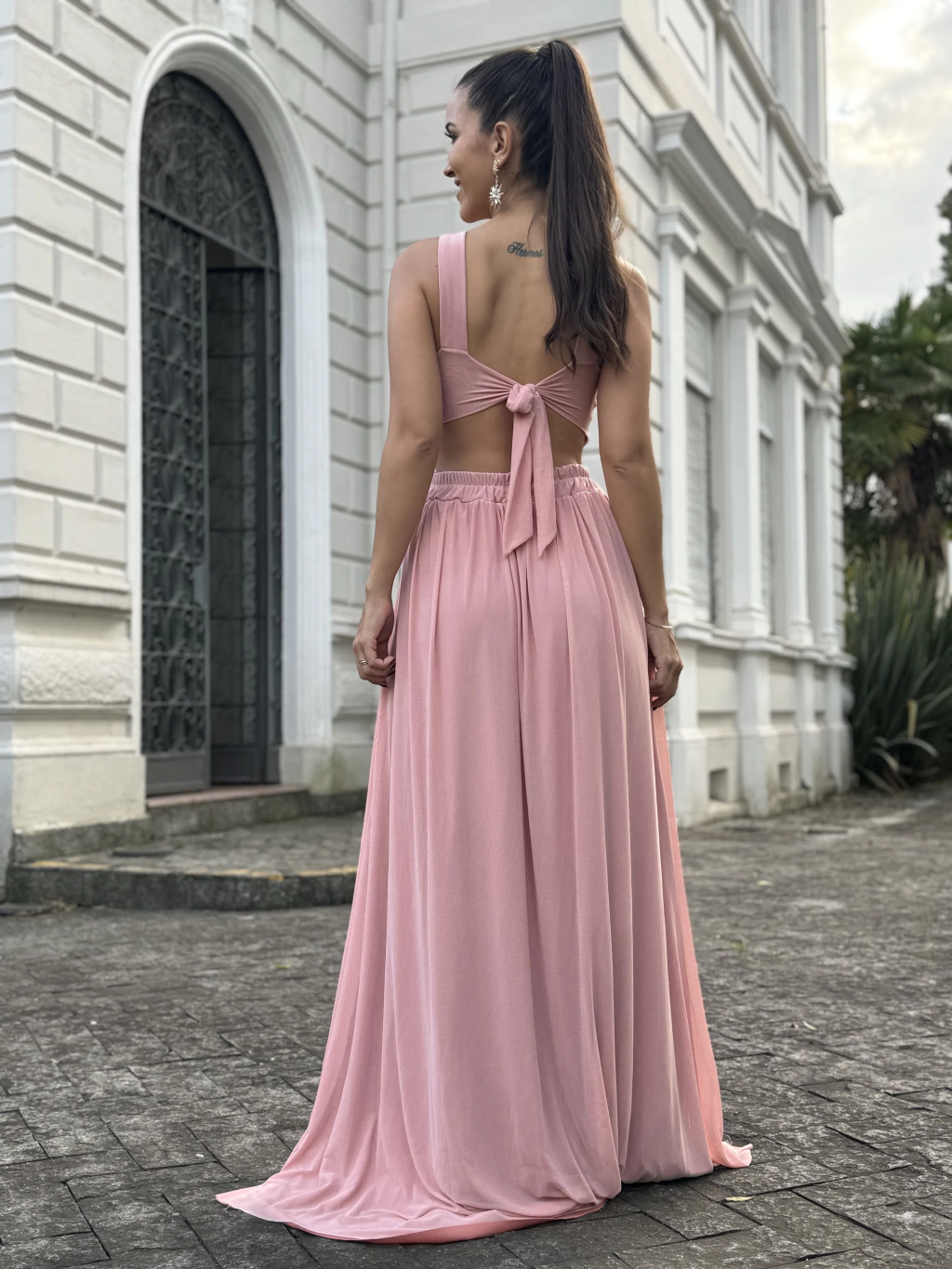 Dicas de como usar: O vestido catherine de tule é uma peça sofisticada e versátil, perfeita para destacar seu estilo. Aposte em acessórios dourados ou prateados para um toque de elegância. Para um visual mais discreto, opte por peças minimalistas. Sandálias de salto fino em tons neutros, como nude ou preto, são ideais para alongar a silhueta. Se preferir algo mais ousado, sapatos metalizados criam um contraste interessante.Uma clutch pequena em cores neutras ou metalizadas complementa o look sem pesar. Para um toque de cor, você pode ousar na escolha da bolsa! Coques baixos ou tranças sofisticadas valorizam o decote e destacam os detalhes do vestido. Cabelos soltos com ondas suaves também combinam perfeitamente para um visual romântico.