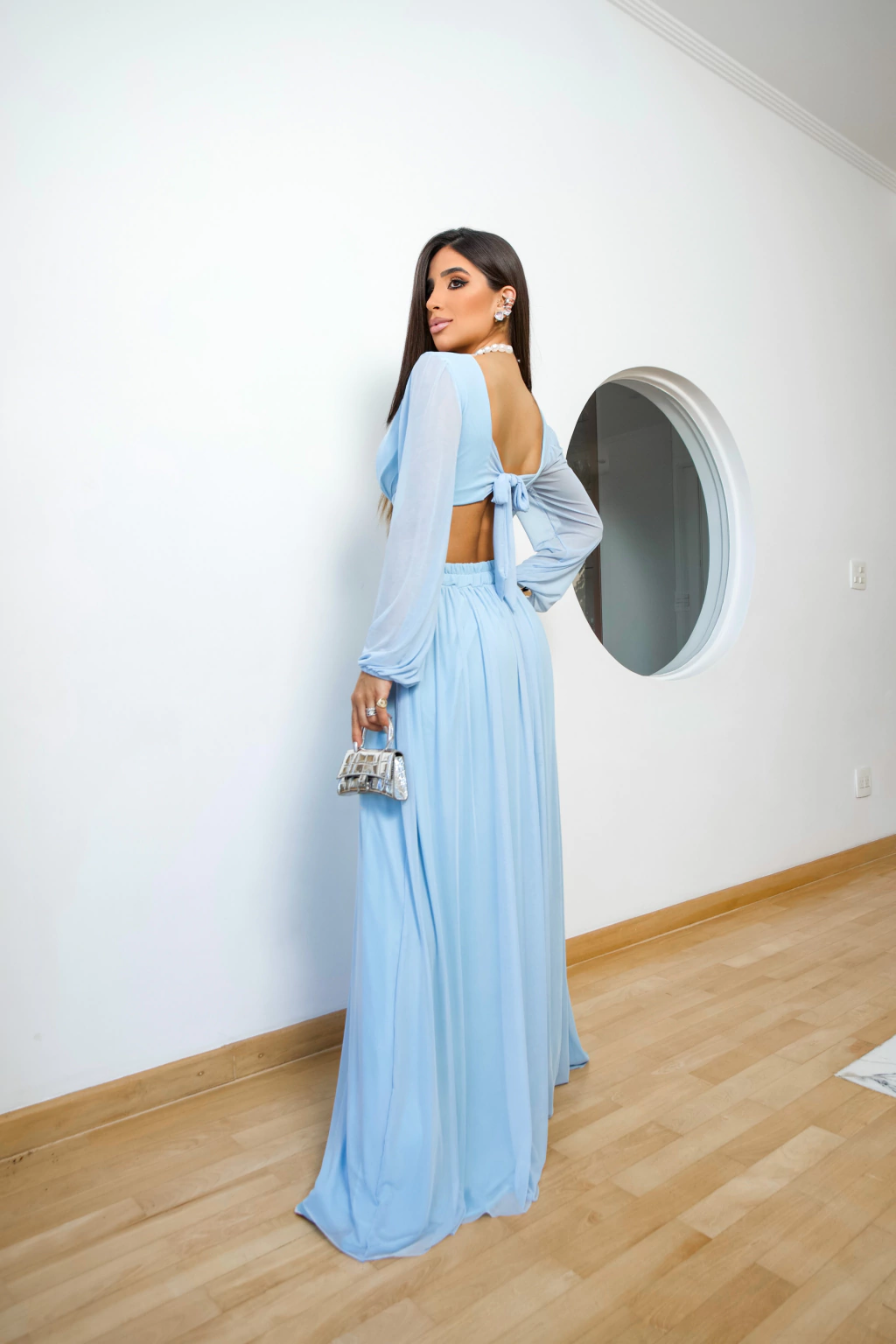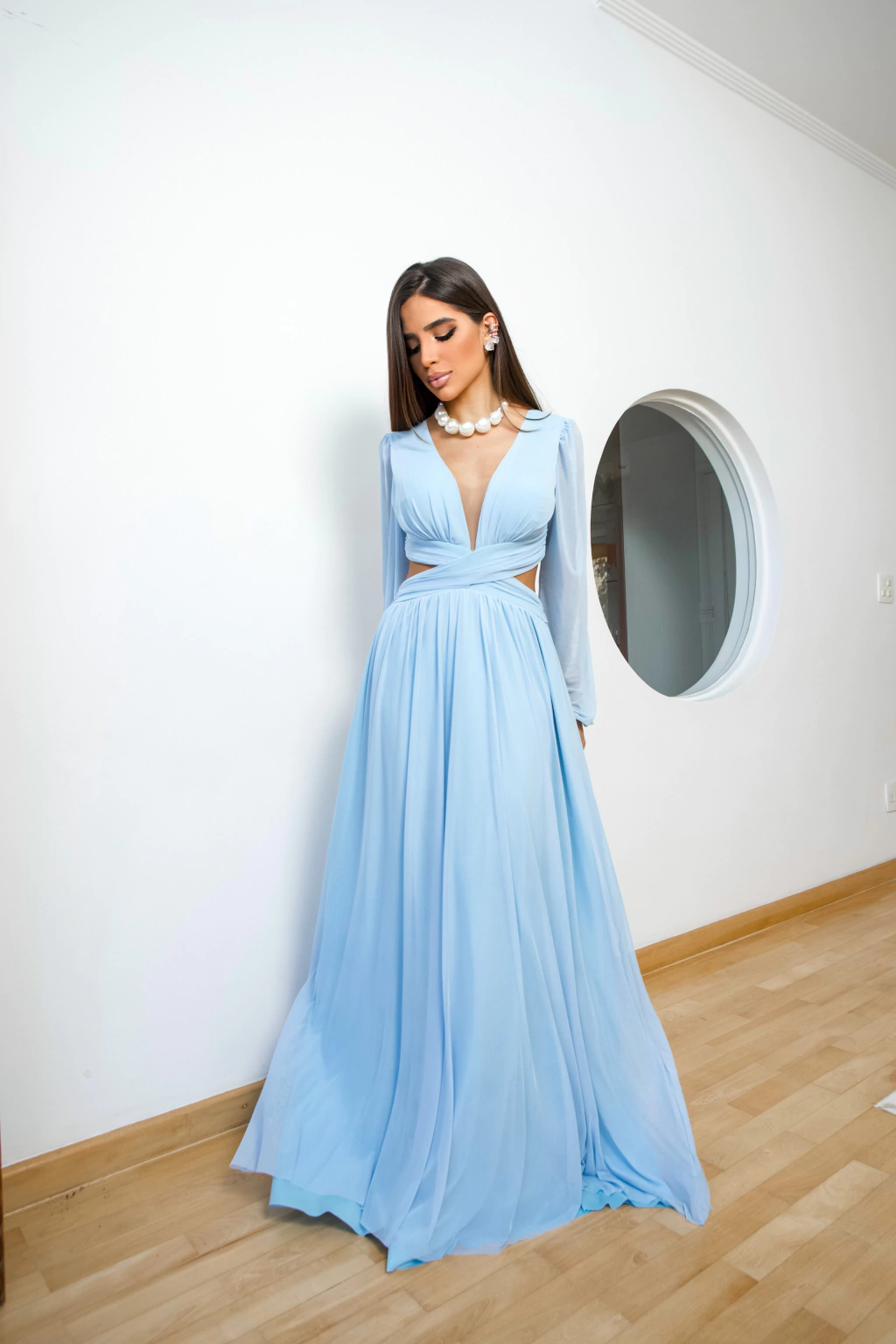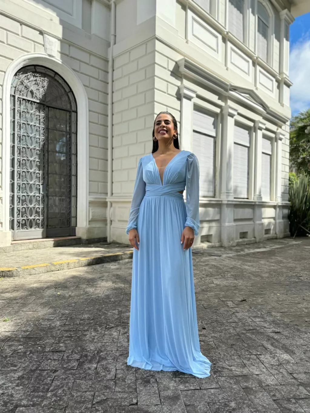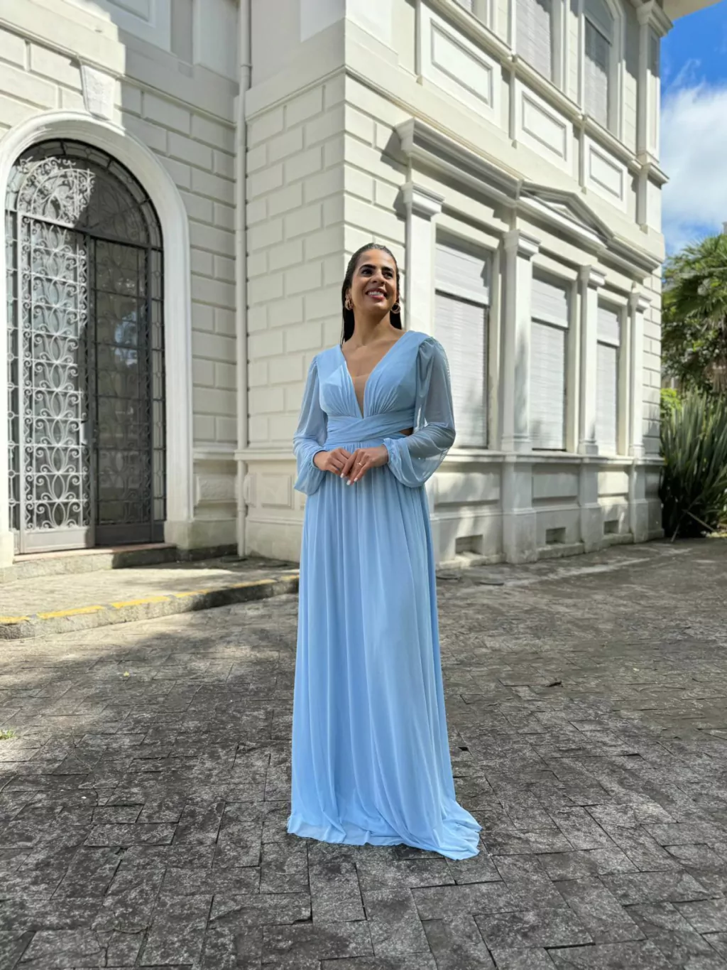 Dicas de como usar: O vestido catherine de tule é uma peça sofisticada e versátil, perfeita para destacar seu estilo. Aposte em acessórios dourados ou prateados para um toque de elegância. Para um visual mais discreto, opte por peças minimalistas. Sandálias de salto fino em tons neutros, como nude ou preto, são ideais para alongar a silhueta. Se preferir algo mais ousado, sapatos metalizados criam um contraste interessante.Uma clutch pequena em cores neutras ou metalizadas complementa o look sem pesar. Para um toque de cor, escolha uma bolsa em tom azul marinho, azul claro ou pink. Coques baixos ou tranças sofisticadas valorizam o decote e destacam os detalhes do vestido. Cabelos soltos com ondas suaves também combinam perfeitamente para um visual romântico.