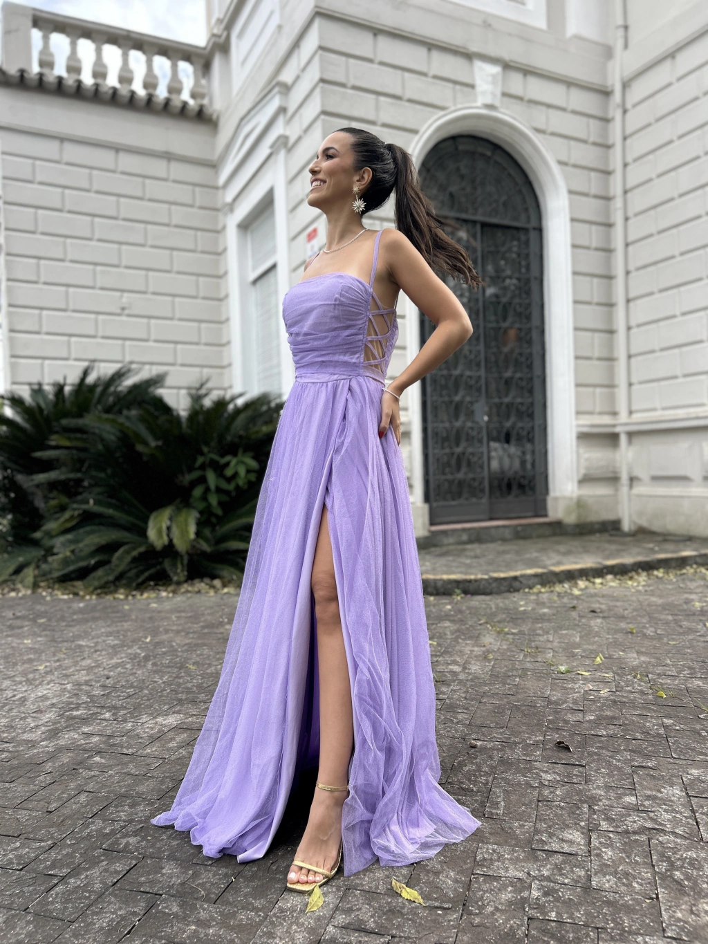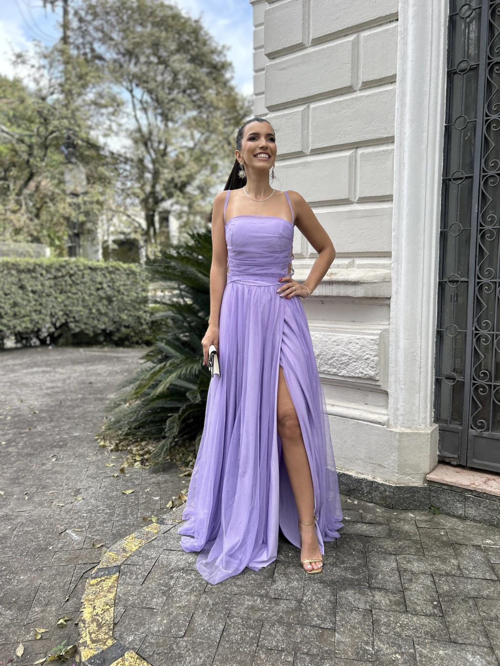 Descrição: Deslumbre-se com este magnífico vestido de tule brilhoso, repleto de glitter que cria um efeito radiante. O decote reto oferece um toque moderno e sofisticado, enquanto a abertura lateral em tule transparente com detalhes cruzados adiciona um charme sensual e elegante. Com fechamento em zíper na parte de trás, o vestido também possui uma fenda que traz movimento e leveza à peça. As alças em tule, igualmente cobertas de glitter, complementam o brilho sem perder o conforto. Seu comprimento longo é perfeito para vestir até as mais altas, fazendo deste modelo a escolha ideal para momentos especiais e glamourosos.