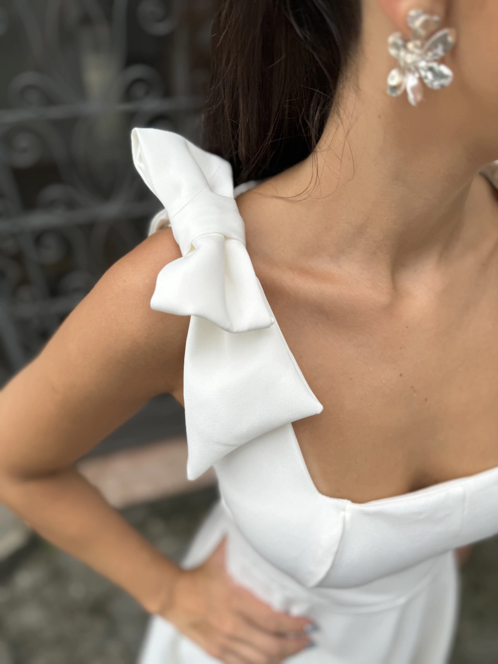 Dicas de como usar: O vestido Maya branco de alfaiataria é perfeito para eventos diurnos, como batizados, brunches elegantes ou até cerimônias civis. Combine com acessórios em tons pastéis ou metálicos suaves para um visual delicado e sofisticado. Uma clutch rosa claro ou prateada/dourada completam o look com elegância.