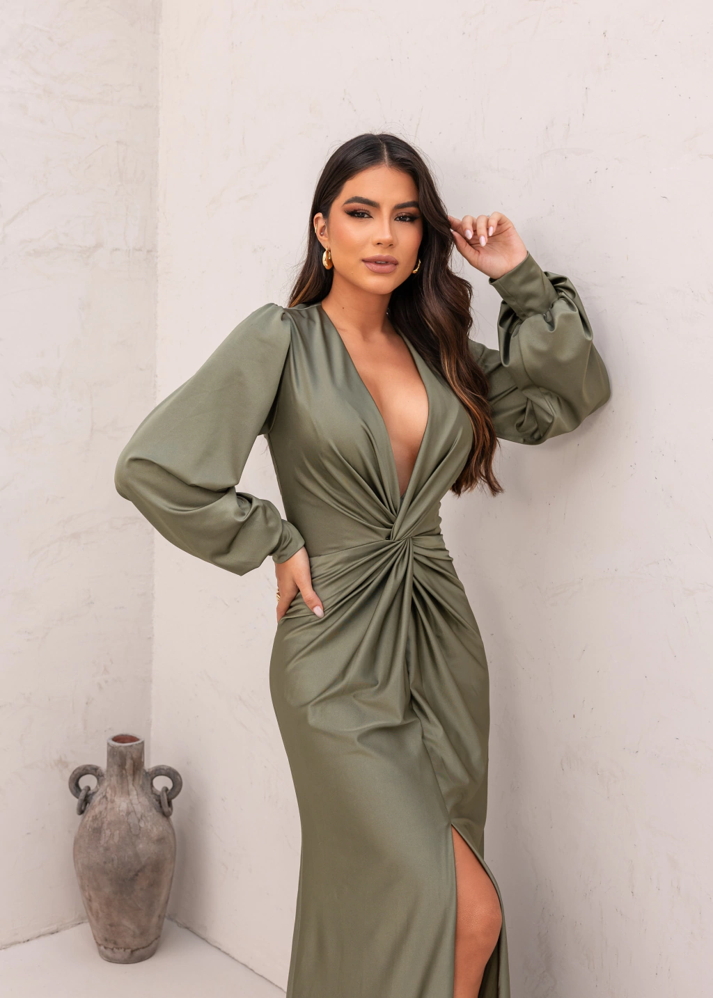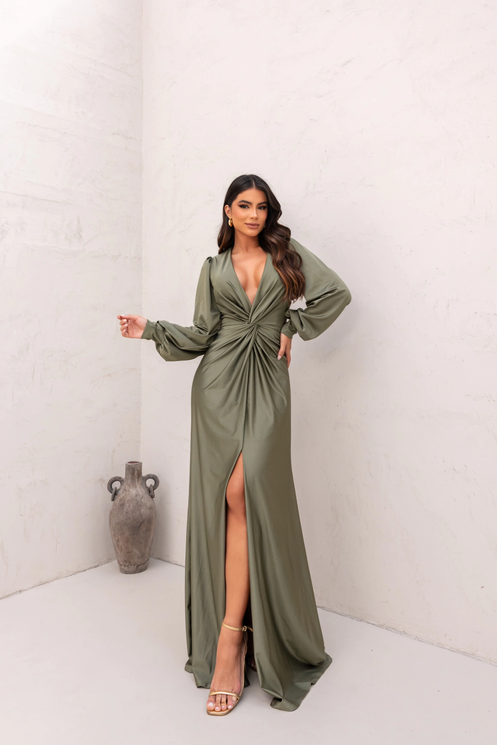 Descrição: Elegância e sofisticação definem este deslumbrante vestido de festa. Com mangas longas e um charmoso detalhe cruzado na frente, este modelo valoriza a silhueta de forma única. A fenda frontal adiciona um toque de ousadia, revelando sutilmente as pernas e proporcionando um movimento fluido e gracioso. Confeccionado em tecido acetinado, o vestido oferece um brilho suave e um caimento impecável, perfeito para eventos especiais. Ideal para quem busca um visual clássico com um toque moderno e cheio de personalidade.